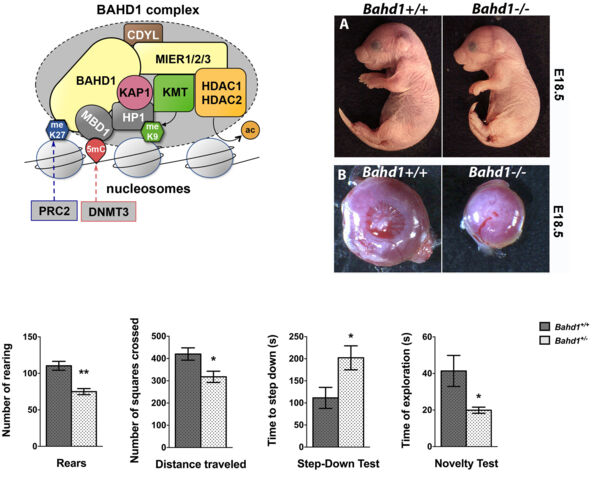 BAHD1 définit un nouveau complexe répressif impliqué dans la régulation épigénétique. BAHD1 s'associe à des régulateurs de la chromatine (MIER, HP1, MBD1, KAP1) et des enzymes modifiant la chromatine (HMTs et HDACs), formant un complexe multiprotéique qui induit la formation d'hétérochromatine (Bierne et al. 2009, Lebreton et al. 2011, Lakisic et al. 2016). La formation d'hétérochromatine médiée par BAHD1 est couplée à la méthylation de l'ADN et pourrait contribuer à l'architecture spatiale du génome (Libertini et al., 2015).